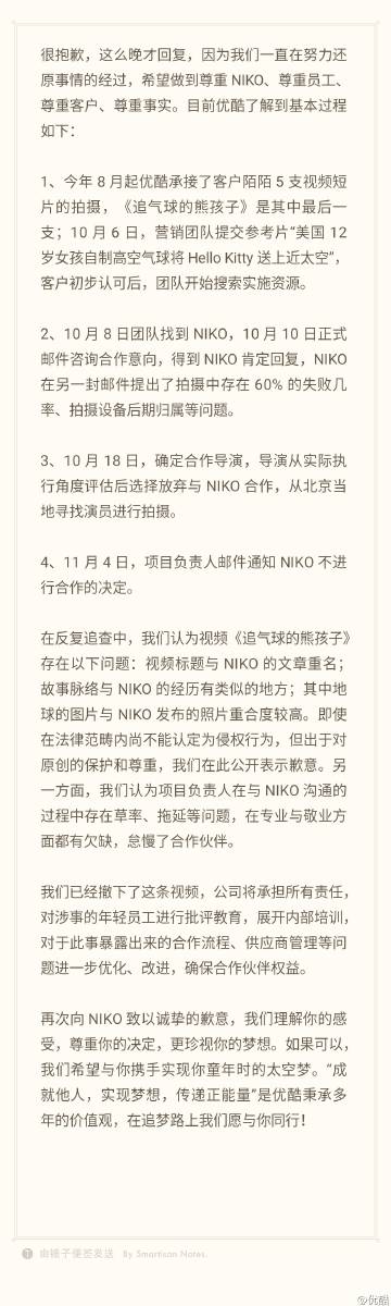 从第三条开始耍流氓,关键就在于决定不与NIKO合作的这段时间发生的事情,也就是获得了思路、脚本构思、实施方法等关键因素之后,自己另外出了一部片子。这些全部被忽略了,最后写上一句“梦想的路上与你同行”显得高大上,不仔细看的人还真以为优酷是受害者//@guanyuhan426: 这段内容基本可以理解为 @优酷: 很抱歉,这么晚才回复,因为我们一直在努力还原事情的经过,希望做到尊重NIKO、尊重员工、尊重客户、尊重事实。@NIKOEDWARDS