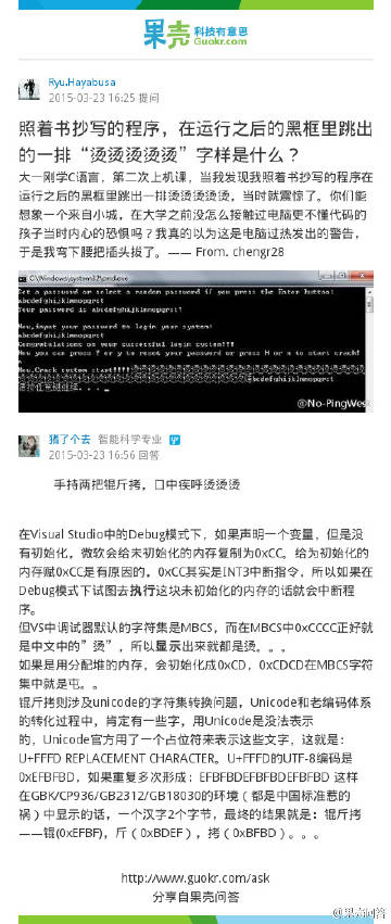 电脑喊烫戳笑点啊 //@果壳网:→_→//@DemiTung訾非于:手持两把锟斤拷,口中疾呼烫烫烫。脚踏千朵屯屯屯,笑看万物锘锘锘 @果壳问答: 【照着书抄写的程序,在运行后跳出一排“烫烫烫烫烫”……什么鬼!?】手持两把锟斤拷,口中疾呼烫烫烫!初学编程的人多少被这个局面吓着过。电脑绝没有运行过热会自己喊“烫烫烫”的功能,这是一个INT3指令在MBCS字符集里的“语言障碍”:照着书抄写的程序,在运行之后的黑框里跳出的一排“烫烫烫烫烫”字样是什么?