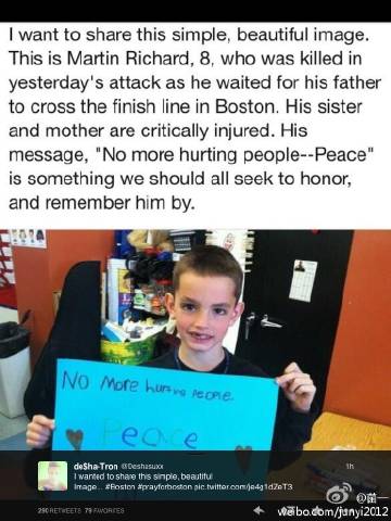 这种报道虐死人了//@超高校级的延边麻织君: //@北美省钱快报: 波士顿马拉松中丧生的8岁小男孩给我们留下的话: No More Hurting Peope - Peace. 不要再互相伤害了,战争不是解决仇恨的方法,我们需要和平。如果大家心里都能多一份无国界的爱,就不会有这种惨剧发生。正能量转起 @菌一_胖子没前途: 波士顿马拉松中丧生的8岁小男孩的照片。@北美省钱快报
