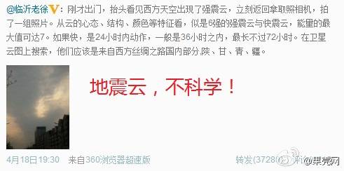 我住学园都市,我支持科学 @果壳: 【地震云,事后之明?】每逢地震灾害,网上总会出现各种“地震云”的照片,这次也不例外。但实际上,地震云只是一个缺乏理论基础的、充满民间想象的“传说”。最早提出“地震云”的不是科学家,而是几十年前日本的一个政客。无论是气象界还是地震研究界,都不认可这个“假说”:【地震特辑】地震云,事后之明?