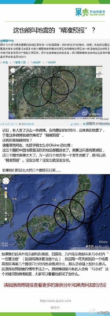 上次那个看云预报地震的 @果壳: 【地震“精确预报”?这能叫精确吗?】有网友“预测”地震,获得了追捧。有人说,他数次“精确预报”了地震。例如,他说图中三个圈内的地区将有“较强震感”,而在划定的72小时内云南真的地震了。这真的是“精确预报”吗?咱们不妨把相同大小的三个圈放到别的国家看看。更多讨论:网页链接