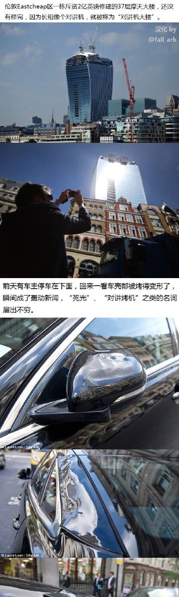 哈哈哈哈!英国人的神智商又来了233333 @果壳: 【哪里是盖房子,这都是死光发射器!】伦敦新建了一座奇葩建筑:玻璃奇亮无比,外形偏偏还是个内凹的,于是……于是把光都聚在一起了好吗,于是楼下的车都烤出泡了好吗,于是光斑过处能煎蛋、过去求证的记者头发都被烤焦了好吗!这样的死光发射器并非伦敦独有:网页链接 图来自:@fall_ark