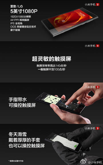 我一同事今天入手小米2S= =//@XiaOchUn_SHWJ: 第一张图就是我的手机么。。。@Resurrection_Stone @Huka_on_duty @小米手机: 【#小米3#迄今为止最快的手机:超灵敏的触摸屏】小米3采用夏普/LG 5英寸全高清IPS视网膜屏:441PPI,1920×1080分辨率,16:9主流比例。全视角,OGS单玻璃全贴合技术。超灵敏的触摸屏,触屏采样率达到140点/秒。手指带水可操控触摸屏,冬天戴着手套也可以。转发送出5个F码。