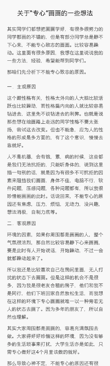曾经能做到的事现在做不到了,原因是环境的改变和自己的修炼没跟上环境的改变//@El-Zheng_艾尔: 感谢分享//@肖壮悦X-tiger: 由内而外地调整自己进入绘画状态。转起! //@XRCG学院:大家请看! //@XRCG-一帆Ethan公爵:这是个比较客观的分析,大烽老师的这篇文章值得每个学画者看看!// @-大烽-: 其实同学们都想把画画学好,有很多很努力的同学都画的不错的,但是有部分同学总是静不下心来,不能专心致志的画画。比较容易躁动。这里面有很多原因,我想在这里说说我的一些方法,经验,希望能帮到同学们。那咱们先分析下不能专心致志的原因。一.主观原因这个跟性格有关,性格太网页链接